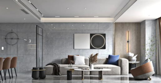 為了塑造客廳的質感,設計師以灰、藍為主色調,再以絨面、石紋等元素加以搭配,讓空間里舒適與優雅氣質完美融合,同時透露著現代人自由自在的生活態度。